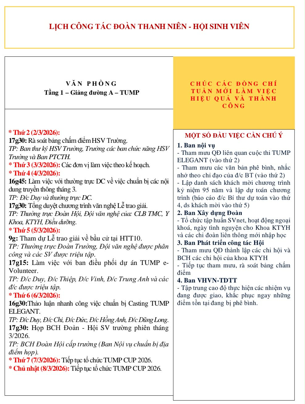 Lịch công tác ĐTN - HSV từ ngày 02/03/2025 - 08/03/2025